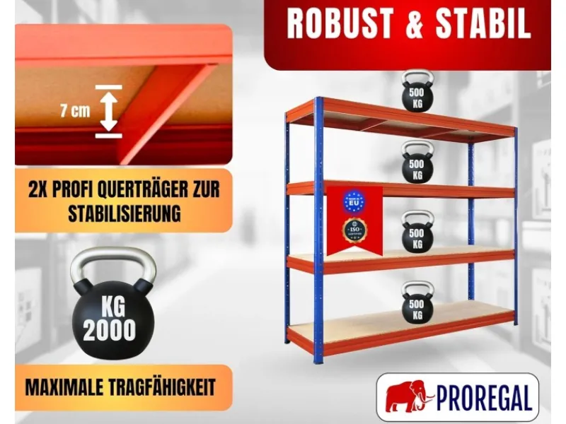 Das Schwerlastregal Dino von PROREGAL löst für Dich die schweren Fälle. Mit einer Fachlast von bis zu 600kg ist dieses Steckregal für extreme Lasten ausgelegt und gleichzeitig bei einer maximalen Breite von 240cm ein echter Alleskönner für Lager und Werkstatt . Das Schwerlastregal ist für professionelle Anwendungen in Handwerk oder Industrie geeignet.