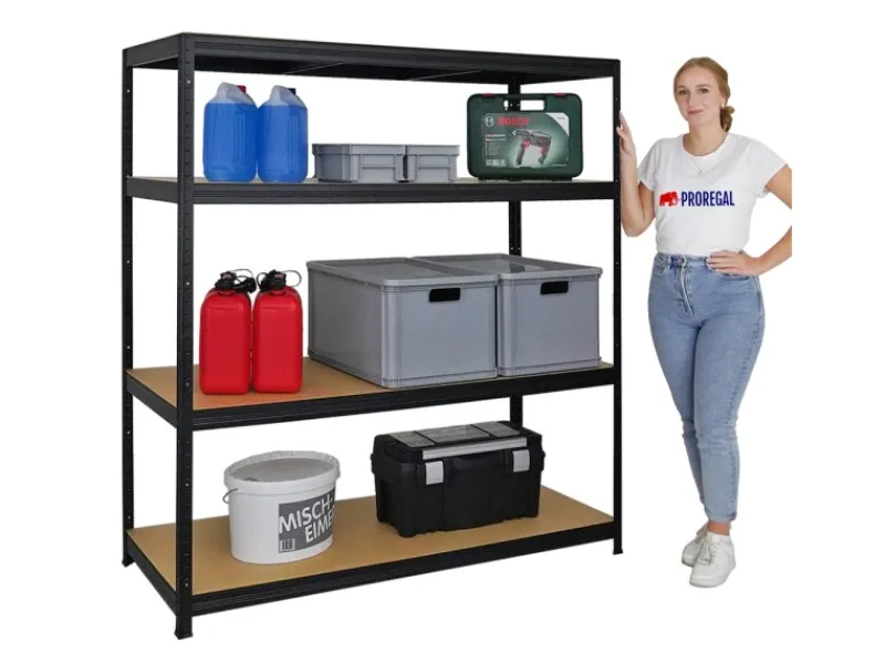 Das Schwerlastregal ist 160 cm hoch, 150 cm breit und 60 cm tief. Die Farbe ist Schwarz