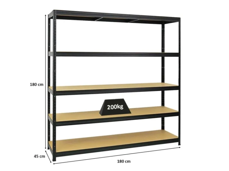 Das Schwerlastregal ist 180 cm hoch, 180 cm breit und 45 cm tief. Die Farbe ist Schwarz