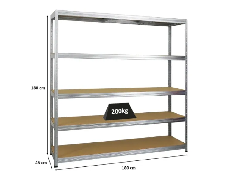 Das Schwerlastregal ist 180 cm hoch, 180 cm breit und 45 cm tief. Die Farbe ist Verzinkt