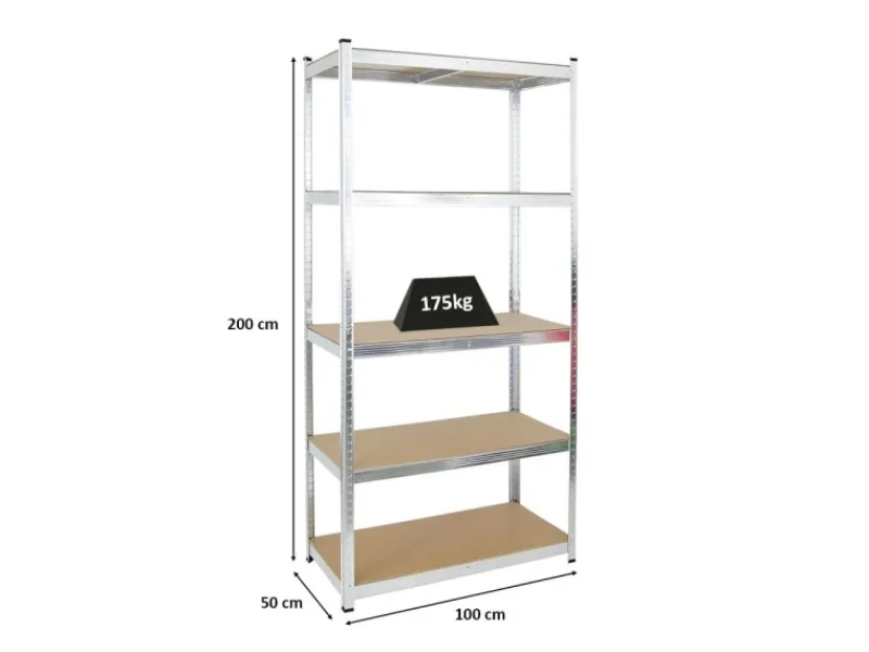Das Schwerlastregal ist 200 cm hoch, 100 cm breit und 50 cm tief. Die Farbe ist Verzinkt.