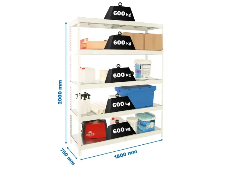 Das Regal ist 200 cm hoch, 180 cm breit, 75 cm tief und hat eine Fachlast von 600 kg.
