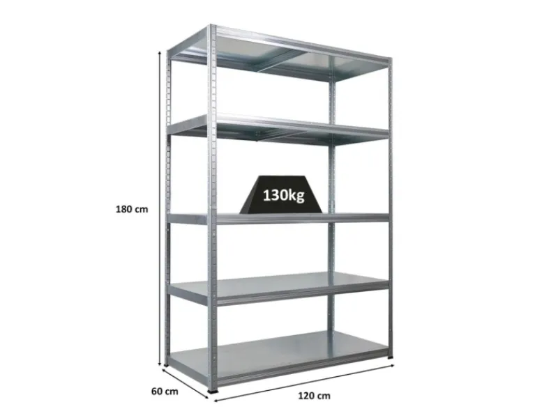 Das Schwerlastregal ist 180 cm hoch, 120 cm breit und 60 cm tief. Die Farbe ist Verzinkt