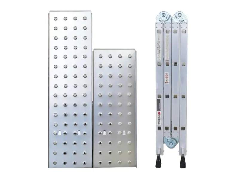 Die 6 Gelenke mit Sicherheitsverriegelung ermöglichen eine sichere Fixierung der Leiter in verschiedenen Winkeln, perfekt für vielseitige Anwendungen. Durch ihre variable Konfiguration und die 2 mitgelieferten Platten kann die Leiter problemlos als Gerüst verwendet werden. Sie bietet eine stabile Arbeitsplattform für sicheres Arbeiten in der Höhe sowie ausreichend Platz für Werkzeuge und Materialien. Die Gerüstplatten sind mit einem rutschfesten Lochdesign ausgestattet, das das Risiko von Ausrutschen minimiert. Integrierte Haken gewährleisten eine sichere und stabile Befestigung an der Leiter und sorgen so für maximale Sicherheit bei der Arbeit.