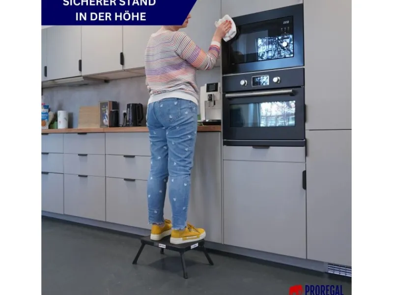 Mit seiner extra breiten Plattform (38 x 26 cm) aus Kunststoff bietet er einen sicheren und komfortablen Aufstieg. Mit einer stabilen Traglast von bis zu 150 kg und einer komfortablen Höhe von 18 cm ist dieser Hocker perfekt für den Einsatz in der Küche, im Büro oder im Haushalt. Für zusätzliche Sicherheit sorgen die rutschfesten Kunststofffüße, die auf jedem Untergrund festen Halt bieten.