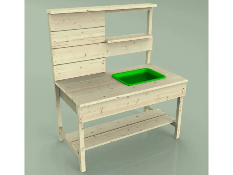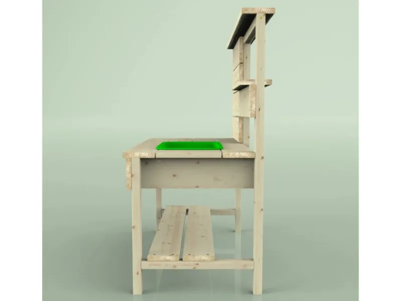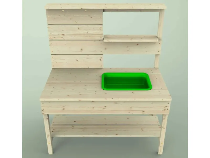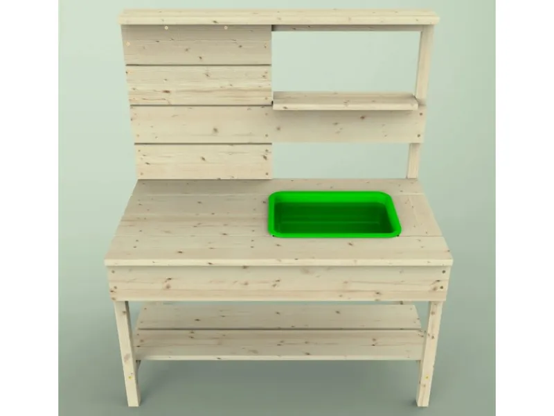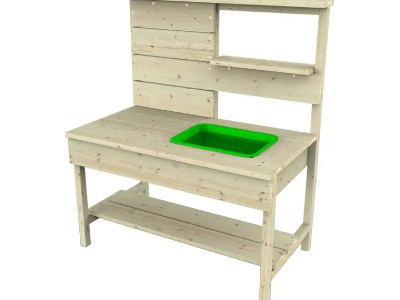 Die Matschküche kommt mit einem grünen Spülbecken und einem Holzregal, das ausreichend Platz für diverse Spielutensilien bietet. Hier können Töpfe, Pfannen und sonstiges Spielzeug problemlos verstaut werden, sodass Ordnung und Übersichtlichkeit gewährleistet sind.