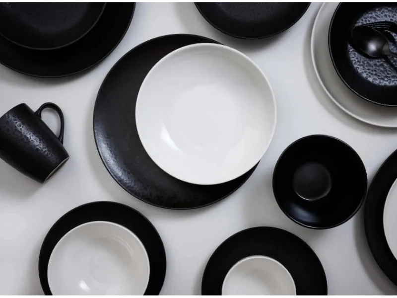 Smart & stylish: Beim kitwe Geschirr fasziniert die Kombination aus Flächen mit gemasertem und solchen mit glattem Finish. Die Maserung, die sich während des Brennvorgangs auf Basis einer sogenannten Reaktivglasur individuell entwickelt, macht jedes Geschirrteil zu einem Unikat. Dank der Coupeform und dem seidenmatten Schwarzton punktet kitwe ganz nebenbei als zeitgemäßes Gourmet-Geschirr.