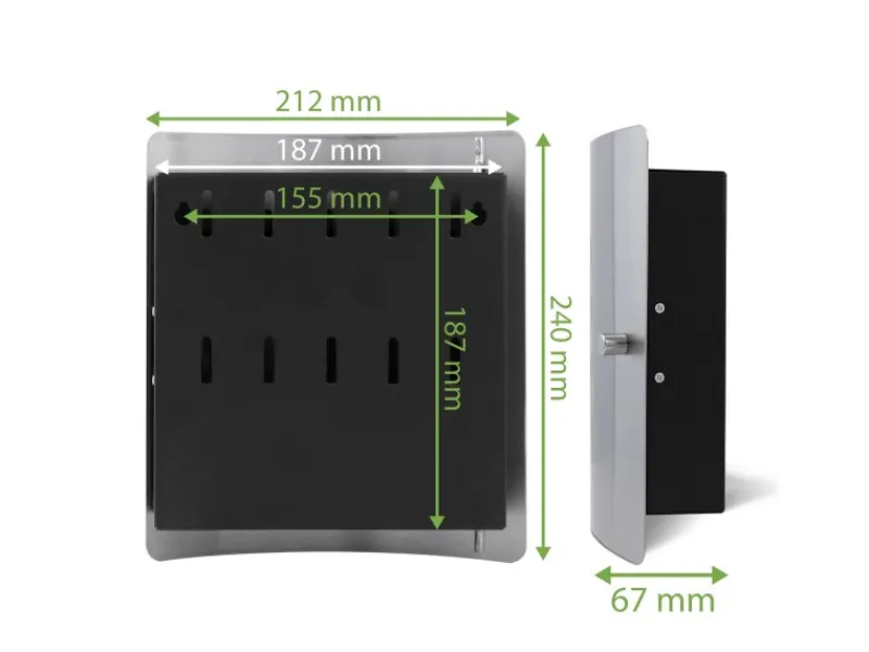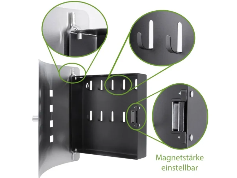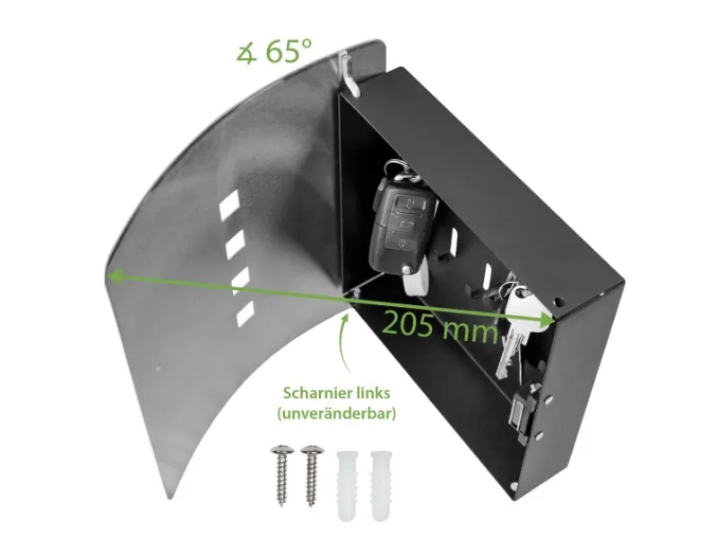 Die Schlüsselbox ist 24cm hoch, 21,5cm breit und 7cm tief. Die Edelstahl Tür hat eine 90° Öffnung und der Korpus kommt in einem dezenten schwarzen Stahlblechgehäuse. Der praktische Magnetverschluss (stufenlos einstellbar) ermöglicht ein schnelles Öffnen und Schließen.
