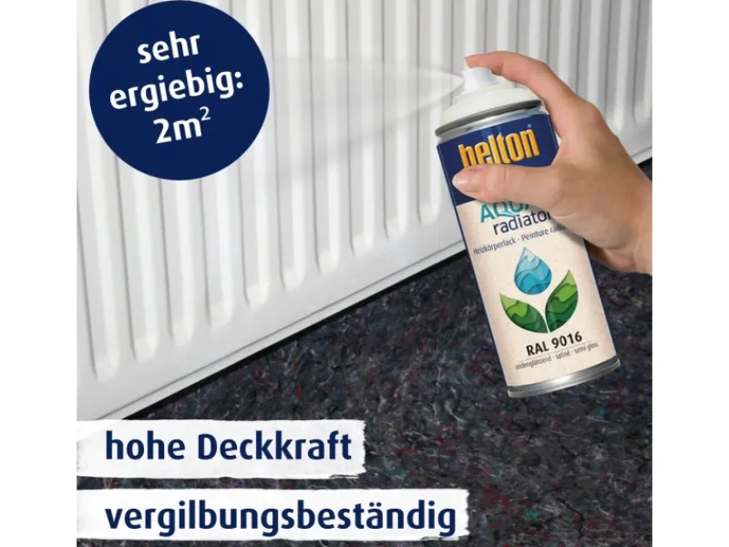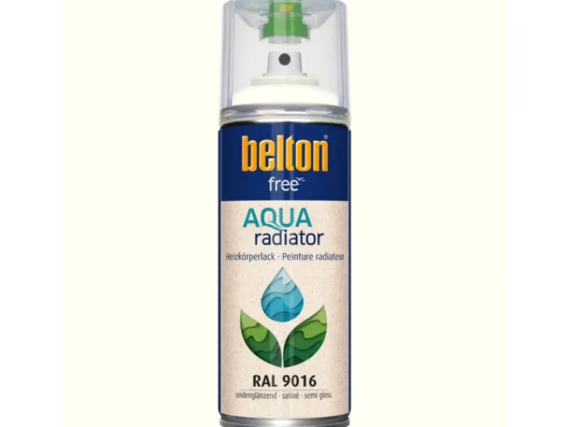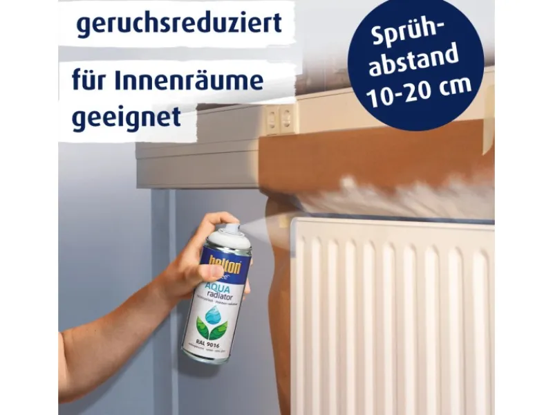 Wasserbasierend und geruchsreduziert. Zur farblichen Verschönerung und Reparaturlackierung von Heizkörpern, Handtuchwärmern, Warmwasserleitungen, Thermogeräten etc. Das Produkt ist vergilbungs- und temperaturbeständig bis +80°C. Der Belton Free AQUAradiator Heizkörperlack hat eine hohe Deckkraft, trocknet schnell und bietet einen Langzeitschutz. Durch Sprühlackierung ist er ideal für Rippen- und Flächen-Heizkörper. In vielen Fällen kann die Demontage und der Transport des Heizkörpers entfallen. Das Produkt hat eine Sprüh- und Kindersicherung, einen zweiten Sprühkopf sowie einen Farbkennzeichnungsring.