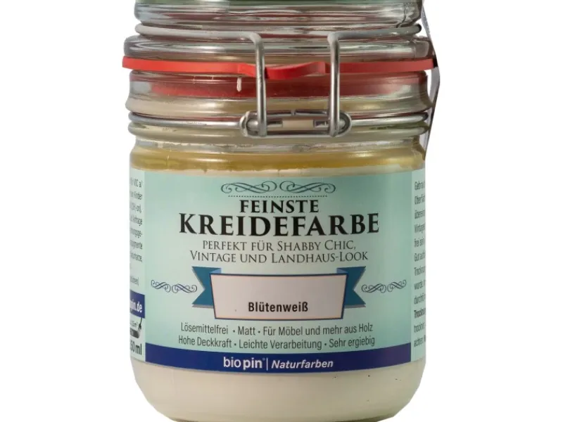 Die Biopin Kreidefarbe in Blütenweiß ist lösemittelfrei und besitzt eine hohe Deckkraft. Mit der Kreidefarbe können Sie Ihrer Kreativität freien Lauf lassen und Ihre Möbel in schönen Farben streichen. Auch den angesagten Shabby-Chic-Stil können Sie mit den matten Farben erhalten.