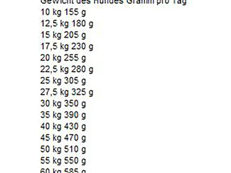 Idealgewicht Deines Hundes Gramm pro Tag, 10 kg 155 g, 12,5 kg 180 g, 15 kg 210 g, 17,5 kg 235 g, 20 kg 260 g, 22,5 kg 280 g, 25 kg 305 g, 27,5 kg 325 g, 30 kg 350 g, 35 kg 395 g, 40 kg 430 g, 45 kg 470 g, 50 kg 510 g, 55 kg 550 g, 60 kg 585 g, Diese Angaben sind Richtwerte. Der individuelle Bedarf hängt von Faktoren wie Alter, Rasse, Aktivität und Haltungsbedingung ab. Bei gesteigerter Aktivität bitte Futtermenge entsprechend erhöhen., Bitte stets frisches Wasser bereitstellen., Kann sowohl trocken als auch angefeuchtet verfüttert werden.