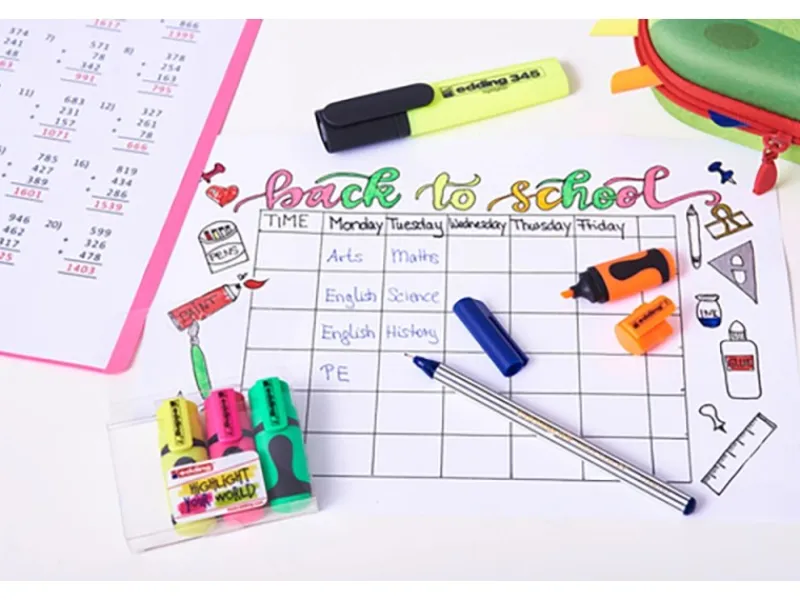 Die Verpackung enthält 5 Mini Textmarker in den Neon-Farben Gelb, Orange, Pink, Grün und Blau.