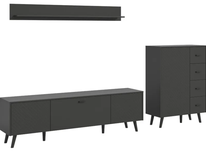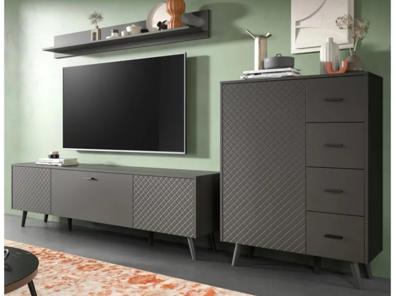 Freuen Sie sich auf die stilvolle Wohnwand „Madea“, die durch ihr modernes Design und ihre Funktionalität überzeugt. Die dreiteilige Wohnkombination umfasst eine stilvolle Kommode, ein praktisches Wandboard und ein TV-Lowboard, alles in einem ansprechenden grauen Mattfinish. Das gefräste Rautenmuster auf der Front verleiht der Wohnwand einen besonderen visuellen Akzent. Die grifflosen Türen sind mit einer Push-to-Open-Funktion ausgestattet, was nicht nur für eine cleane Optik sorgt, sondern auch den Komfort erhöht. Die konischen Holzfüße mit einer Höhe von 157 mm runden das Design harmonisch ab und bieten gleichzeitig Stabilität. Mit den Maßen 269 x 175 x 40 cm passt sie perfekt in jedes Zuhause.