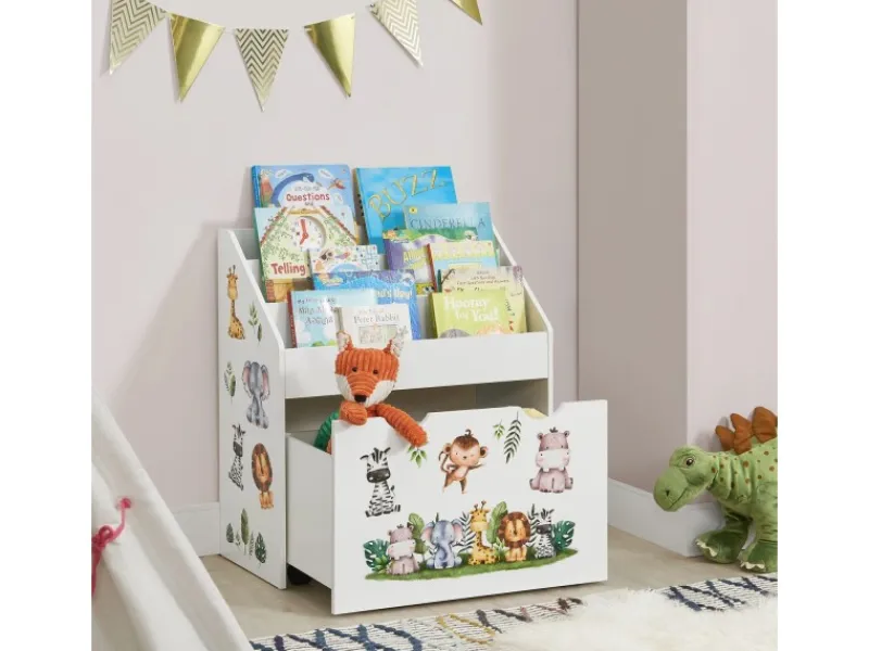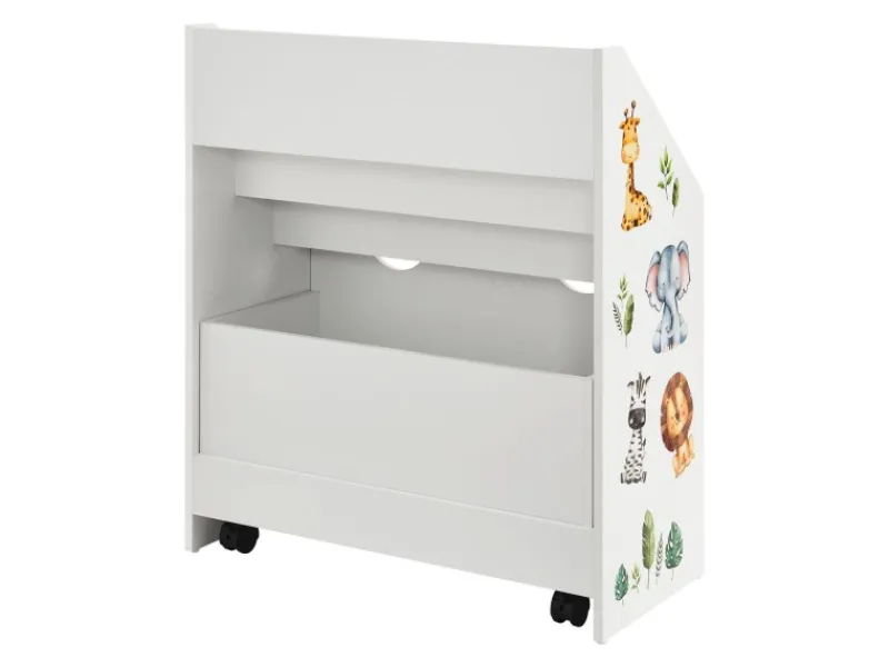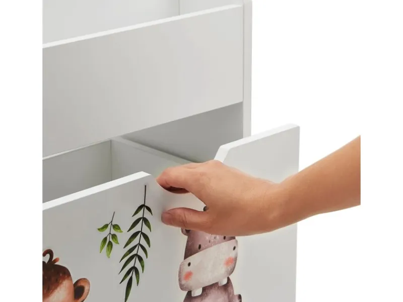 Stauraum für Bücher & Spielzeug | Spielerische FörderungIm Kinder Bücherregal mit 3 Fächern und herausziehbarer Spielzeugkiste verstauen Sie Kinderbücher und Spielzeug ordentlich. Das stabile Regal aus Holz bringt Ordnung ins Wohnzimmer und Kinderzimmer. Zugleich trägt es spielerisch zur kindlichen Entwicklung bei. An dem Bücherregal für Kleinkinder lernt ihr Nachwuchs den Umgang mit Büchern, sprich das eigenständige Aussuchen und Aufräumen. Bücher sind stets präsent – wichtig für Bildung. Zudem begeistern die niedlichen Tiersticker. Sicherheit bietet die abgerundete Ecke. Alternativ ist der Organizer für Zeitschriften nutzbar.Produktmerkmale Kinderschrank: