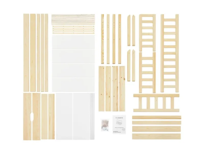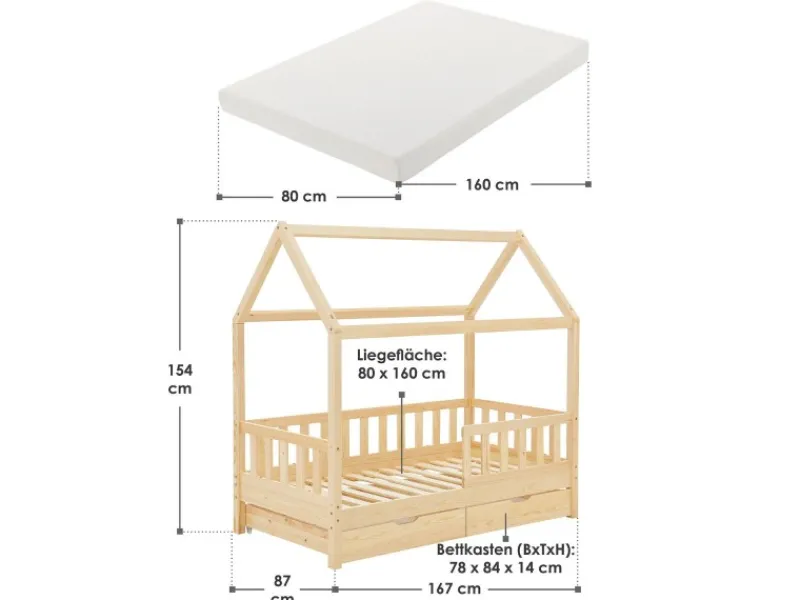 Kinderhausbett mit Dach & Stauraum unter dem Bett Das Kinderbett Marli 80×160 cm mit Bettkasten, Matratze, Rausfallschutz und Lattenrost überzeugt Mädchen und Jungen von 3 bis 10 Jahren. Verschönern Sie das Kinderzimmer mitdem modernen Hausbett, das Schlafplatz, Spielbett und Stauraum in einem ist. Spielzeug & Co. verstauen Sie ordentlich und platzsparend in dem großen 2-teiligen Bettkasten. Und die Hausoptik mit Dach bietet viele Möglichkeiten zur Gestaltung – als Höhle oder mit Himmeldekoration. Ausgestattet mit einem Gitter, bietet das Bett fürjunge Kinder zudem Schutz und Sicherheit. Für einen langen Einsatz ist das Holzbett aus massivem und pflegeleichtem Kiefernholz die richtige Wahl. Produktmerkmale Bett mit Matratze:
