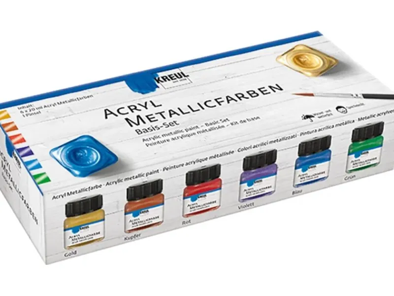 Die Kreul Acryl Metallicfarben schillern bereits im Urzustand und krönen jeden DIY-Auftritt. Kostbares Gold, feurig-funkelndes Kupfer oder Rot – der einzigartige Diamant-Glanz findet sich in den 6 Farbtönen der Metallicfarben und macht jede Deko unbezahlbar. Ihren dramatischsten Auftritt erhält die Farbe, wenn sie großflächig aufgetragen und reizvoll kombiniert wird, z.B. auf hellem Holz oder auf robustem trockener Beton. Die metallischen Farben entfalten ihren Charme, wenn Gegensätze aufeinander treffen.
