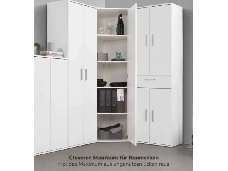 Das Produkt UNGENUTZTE ECKEN ADÉ. Unser Eck- & Mehrzweckschrank ‚Der Lange‘ besticht nicht nur durch sein modernes Design, sondern schafft auch in kleinen Raumecken viel Stauraum. Produziert in Deutschland. Zeitloser Klassiker. Unser Haushaltsschrank kommt in 3 verschiedenen Dekoren und passt so perfekt in verschiedenste Wohnräume. In Kombination mit unseren weiteren erhältlichen Akten-, Garderoben- oder Besenschränken der basiqs Kollektion bildet er das funktionale Herzstück deiner individuellen Schrankwand. Ein Schrank kommt selten allein! Mehr Stauraum in Arbeitszimmer, Schlaf- & Gästezimmer, Bad oder Flur bzw. Abstellraum benötigt? Unser Eckschrank ist kombinierbar mit unseren Mehrzweckschränken der ‚Kurze, ‚Schlanke‘ oder ‚Lange‘ sowie der Kommode ‚Die Elegante’. Die 4 mitgelieferten Einlegeböden kannst du beliebig an 10 verschiedenen Positionen montieren.
