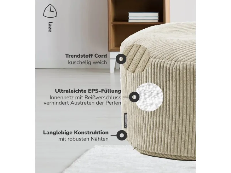 Das Produkt MADE IN GERMANY! Von hochwertigen & weichen Stoffen über den EPS-Safety-Lock bis zur formbeständigen & Allergiker-freundlichen Füllung aus EPS-Perlen – unsere Indoor Poufs in grau, beige & anthrazit erfüllen höchste Qualitätsansprüche. Hergestellt im Schwarzwald. GEMÜTLICHKEIT, DIE GUT AUSSIEHT! Der flauschige Cord macht das Sitzkissen nicht nur zum stylischen Hingucker, sondern überzeugt auch durch seine angenehme Haptik und langlebige Eigenschaften. Bezug waschbar bei 30° Schonwaschgang (vorher EPS-Perlen entnehmen). ULTRALEICHT & BEQUEM! Dank der flexiblen Füllung passt sich der Hocker deinem Körper an. Zudem kannst du Füllmaterial entnehmen/zufügen, um den Komfort an deine Bedürfnisse anzupassen. Volumen kann nutzungsbedingt nachlassen, Nachfüllpack ‚Der Nachfüller‘ erhältlich.