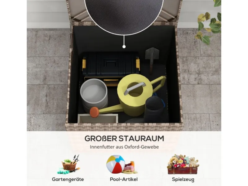 Bewahren Sie Ihre Sitzauflagen, Gartengeräte oder Spielzeuge immer sauber und griffbereit mit dieser zeitlosen Auflagenbox auf. Die robuste Auflagenbox mit Metallrahmen bietet nicht nur effektiven Schutz, sondern verleiht Ihrem Außenbereich auch eine natürlich elegante Ästhetik. Dank der Wasserbeständigkeit ist sie perfekt für Outdoorbereiche wie Veranda, Terrasse, Balkon oder Garten geeignet. Die beste Wahl für stilvolle Outdoor-Aufbewahrung!
