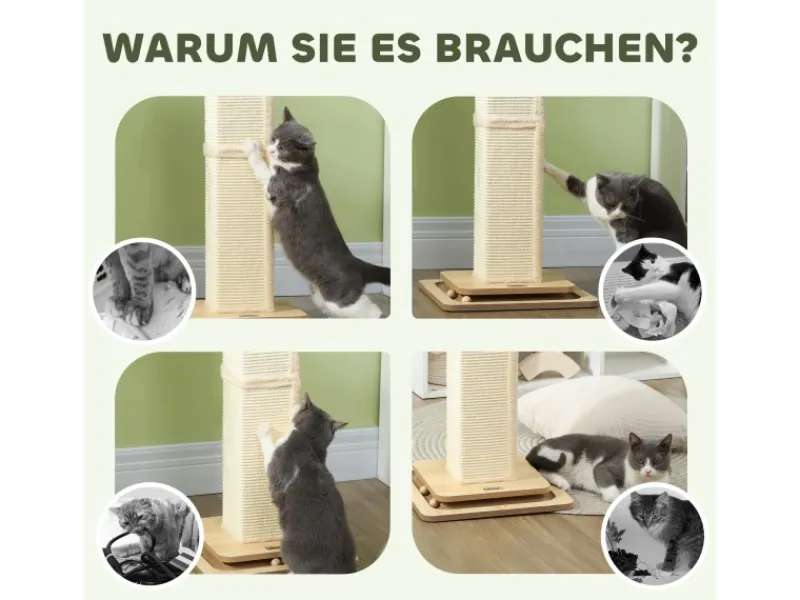● Das 3-in-1-Design der Kratzsäule bietet vielfältige Funktionen für Katzenunterhaltung
