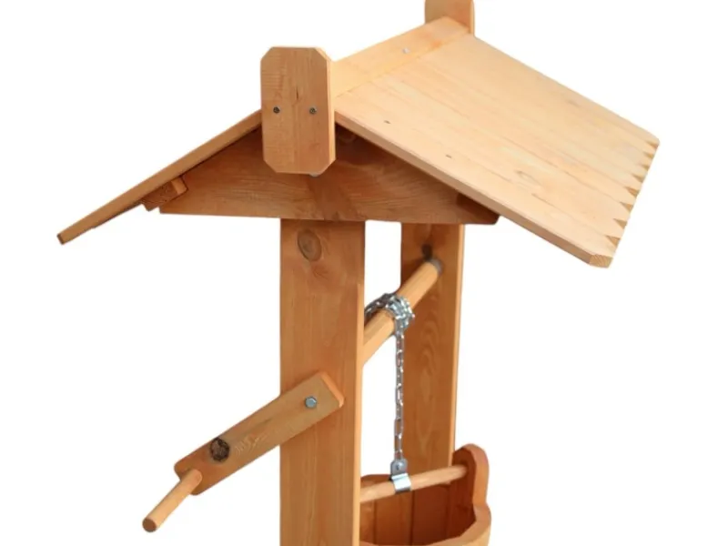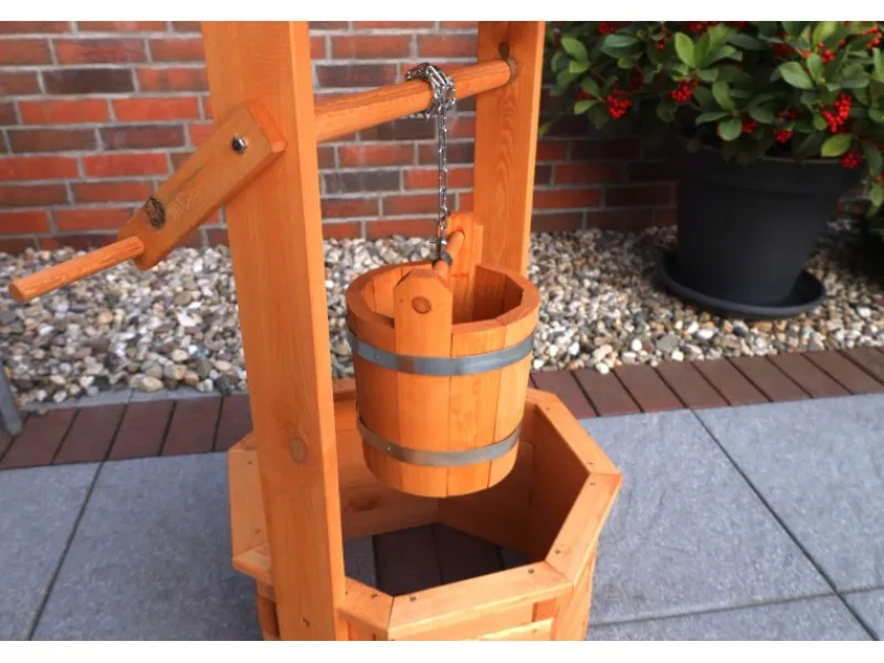 Der Zierbrunnen Nürnberg ist ein Blickfang, auch für kleine Gärten. Der Brunnen besteht aus imprägnierten Massivholz und ist leicht zu montieren. Zum Lieferumfang gehören Schöpfeimer und Kette. Die Beschläge sind verzinkt.