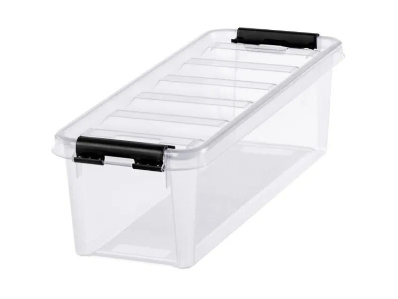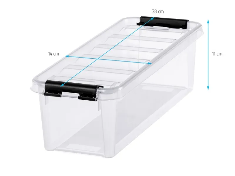 Diese schmale 3,5 l Box eignet sich perfekt zur Aufbewahrung von Kerzen, Pinseln, Stiften, Werkzeugen und Büromaterial. Das transparente Material erleichtert die Sicht auf den Inhalt. Stabile Clips aus robustem Kunststoff sorgen für einen sicheren Verschluss des Deckels.