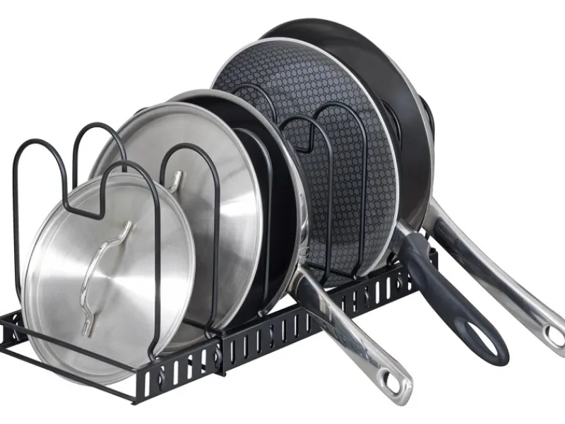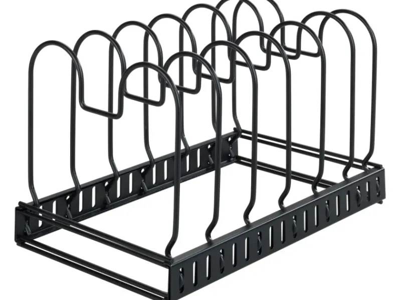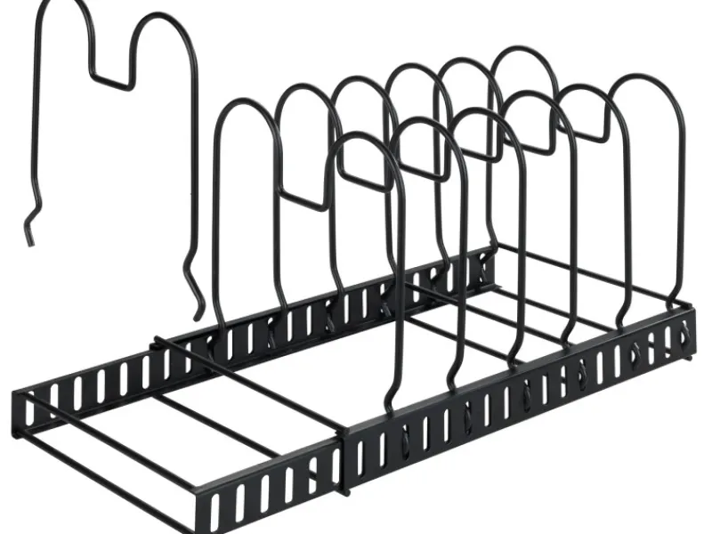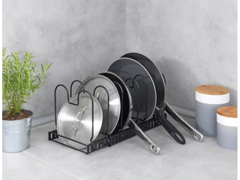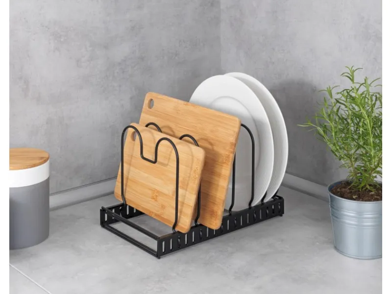 Ordnung macht Laune! Der moderne Geschirrständer ermöglicht eine platzsparende und übersichtliche Aufbewahrung von Pfannen, Deckeln, Backformen, Geschirr, Auflaufformen, Schneidebrettern, etc. in unterschiedlichen Größen.