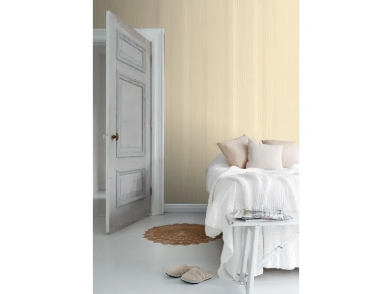 Diese trendige und fröhliche Tapete mit Streifenmuster in Gelb lässt jede Wand strahlen! Die Tapete kann mit vielen Farben kombiniert werden und das macht diese Tapete zu einem absoluten Must-Have. Maße, Rapport und Musterversatz Die Maße dieser Tapete sind 50 x 900 cm (Breite x Länge). Der Rapport ist 0 cm und die Tapete ist ansatzfrei. Das heißt, dass das Motiv sich alle 0 cm wiederholt und das Muster der einzelnen Tapetenbahnen beim Anbringen der Tapete nicht berücksichtigt werden muss.Tapezieren Das Anbringen dieser Vliestapete ist einfach und unkompliziert: nachdem der Vlies-Kleister direkt auf die Wand aufgebracht wurde, kann die Tapete angesetzt und anschließend glattgestrichen werden. Eventuelle Überstande können mit einem Cuttermesser entfernt werden. Beim Tapezieren wird kein Tapeziertisch benötigt und die Tapete ist auch nach Jahren restlos trocken abziehbar. Für das beste Tapezierergebnis empfiehlt Sanders & Sanders den professionellen Wallpro PRO-301 Tapetenkleister. Vorbereitungstipp: Verhindere Probleme mit der Haftung deines Tapeten, indem du vorher testest, ob deine Wandoberfläche stark saugend ist. Nimm dazu einen feuchten Schwamm und befeuchte einen kleinen Teil der Wand. Wenn der feuchte Bereich innerhalb weniger Sekunden verschwindet, ist die Wand sehr saugfähig. In diesem Fall empfehlen wir, ein Grundiermittel zu verwenden, um die Saugfähigkeit zu verringern. Sanders & Sanders empfiehlt hierfür die WALL PRO-401 Tapetenprimer.Sofort startklar! Am einfachsten ist es, direkt auch der benötigte Tapetenkleister und ein Wallpro PRO-933 Tapezierset zu bestellen. Dieses Tapezierset enthält alle Tapezierwerkzeuge, die beim Tapezieren von Vliestapeten benötigt werden. Diese Artikel können über das Suchfenster auf der Amazon Seite schnell gefunden und bestellt werden. So wird das Tapezieren zum Kinderspiel!