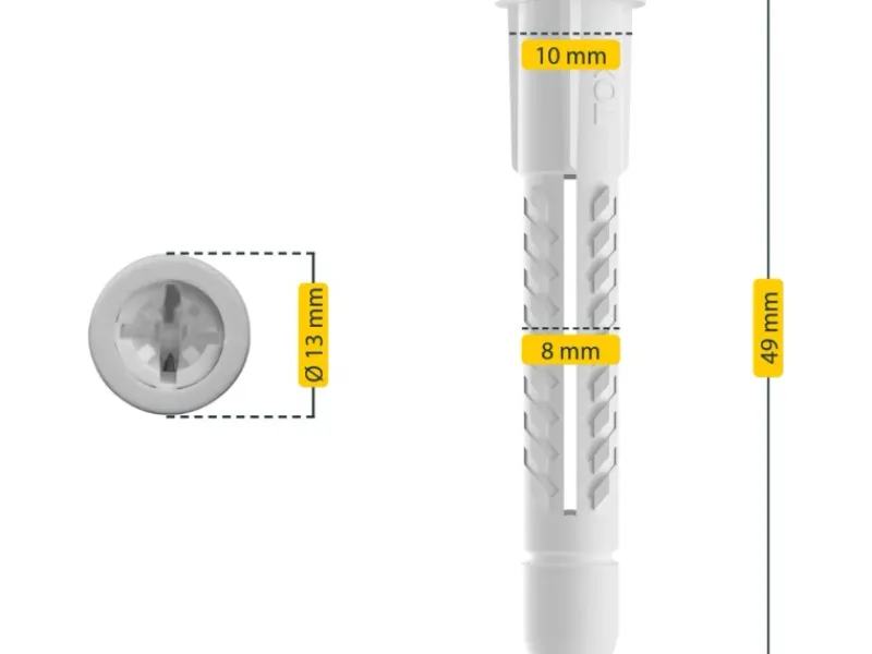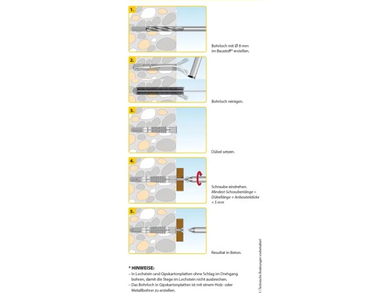 Je nach Baustoff spreizt oder verknotet er sich beim Eindrehen der Schraube und ermöglicht so einen vielseitigen Einsatz. Dank des vierfach geteilten Körpers sorgt der Allzweckdübel für eine gleichmäßige Kraftverteilung im Bohrloch. Mit einer Drehsicherung am Dübelhals sowie Drehflügel am Dübelkörper beugt er einem Mitdrehen der Schraube bei der Montage vor. Der Rand an der Dübelkappe verhindert zudem ein Tieferrutschen des Allzweckdübels in das Bohrloch und schützt gleichzeitig die Oberfläche des Untergrunds.