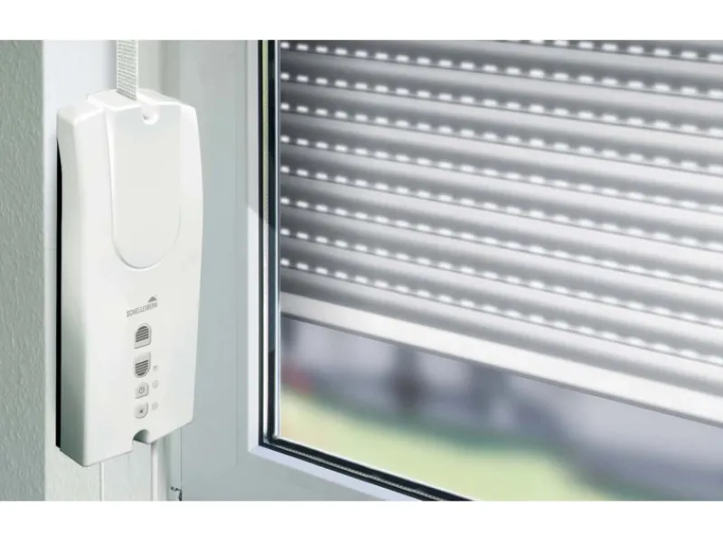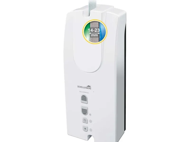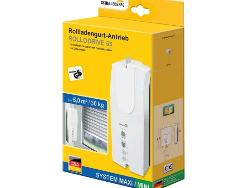 Der Schellenberg RolloDrive 55 ermöglicht die Bedienung eines Rollladens bequem per Knopfdruck oder Zeitautomatik. Der elektrische Gurtwickler ist für Kunststoff-Rollläden bis zu einer Fläche von 5 m² geeignet und kompatibel mit den Rollladensystemen Mini und Maxi mit einer Gurtbreite von 14 bzw. 23 mm. Er wird Aufputz auf der Wand oder in der Fensterlaibung montiert und ist ideal für Mietobjekte geeignet, da für den Einbau das Öffnen des Rollladenkastens nicht notwendig ist.