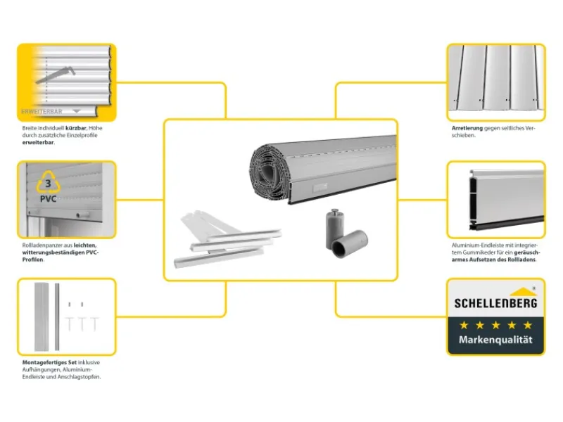 Die PVC-Lamellen des Rollladenpanzers sind leicht witterungsbeständig und haben ein stabiles Mehrkammer-System. Sie entsprechen dem Schellenberg Rollladensystem Mini, haben eine Deckhöhe von 52 mm und eine Tiefe von 14 mm. Die im Set enthaltene Abschlussleiste verfügt über einen integrierten Gummikeder, der für ein geräuscharmes Aufsetzen des Rollladens und zur Verhinderung von Festfrieren oder Beschädigungen an der Fensterbank sorgt.