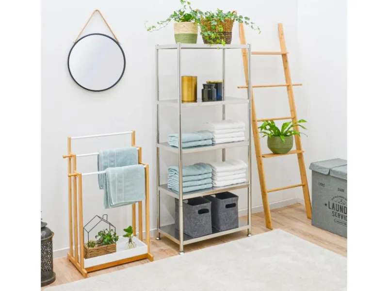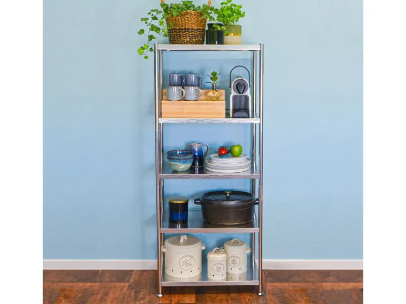 Das hochwertige Edelstahlregal mit 5 großen Ablagen schafft jede Menge extra Stauraum.