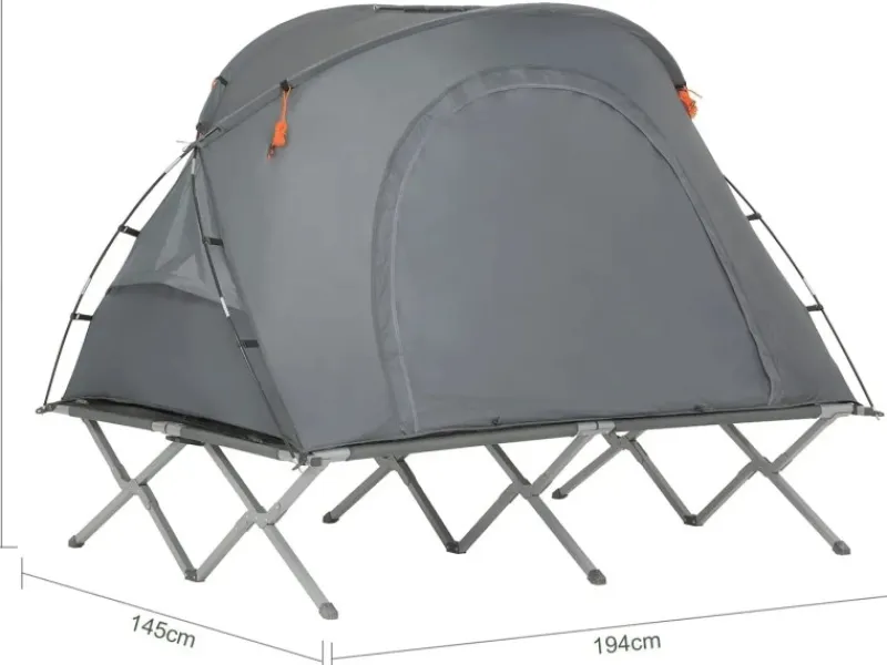 Gewicht: ca.: 21,7kg; Belastbarkeit: bis 300kg; Material: Gestell aus Metall und Glasfaser, Zelt aus Polyester, Feldbett aus widerstandsfähigen Oxford-Nylon. Produktmaße: BHT ca. 194x157x145cm (siehe Abbildung); Paketmaße: 106x51x33cm.