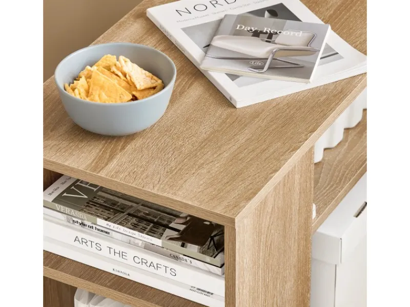 Zwei offene Fächer bieten Stauraum für Bücher, Pflanzen, Deko und halten den Bereich ordentlich.