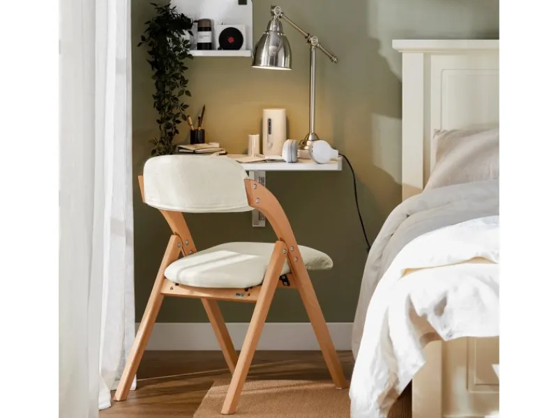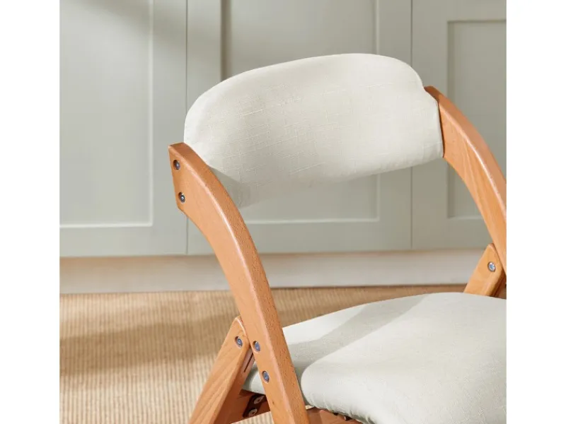 Dieser klappbare Holzstuhl besteht aus hochwertigem Buchen- und Pappelholz und ist mit einer stabilen Dreiecksstruktur sowie rutschfesten Fußpads ausgestattet.