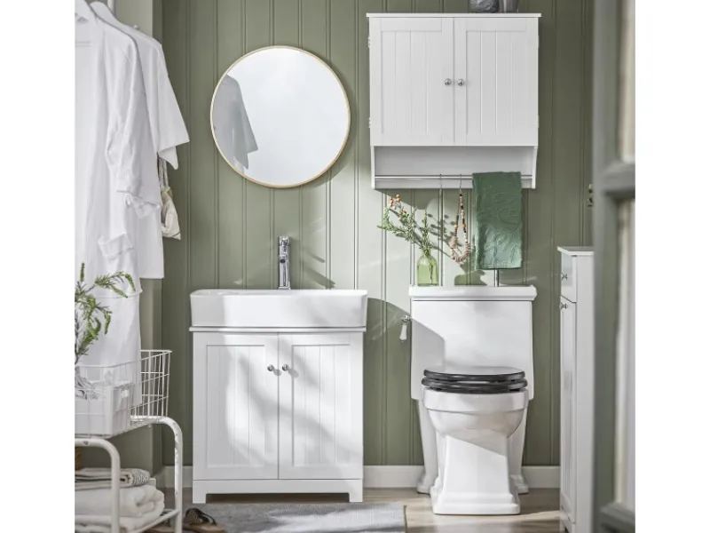 Kann auch als 7-teiliges Set erworben werden: Hochschrank (BZR17-W), Hängeschrank(BZR84-W & BZR19-W), Waschbeckenunterschrank (BZR18-W & BZR18-II-W) und Wäschetruhe (BZR21-W & BZR33-W).