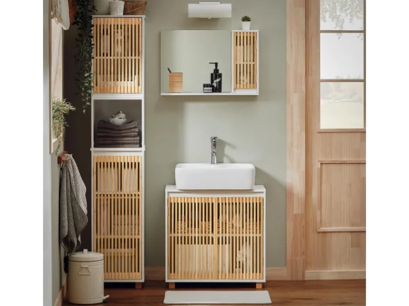 Die Türen und Beine aus Bambus machen diesen Schrank langlebiger und verleihen dem Raum ein natürliches Aussehen.