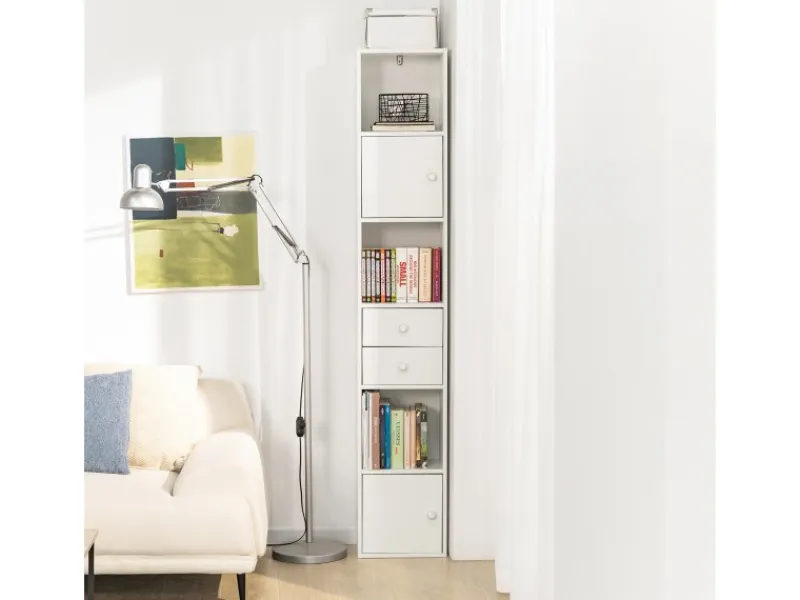 Das Bücherregal mit 3 Fächern, 2 Schubladen und 2 Türen bietet ausreichend Stauraum.