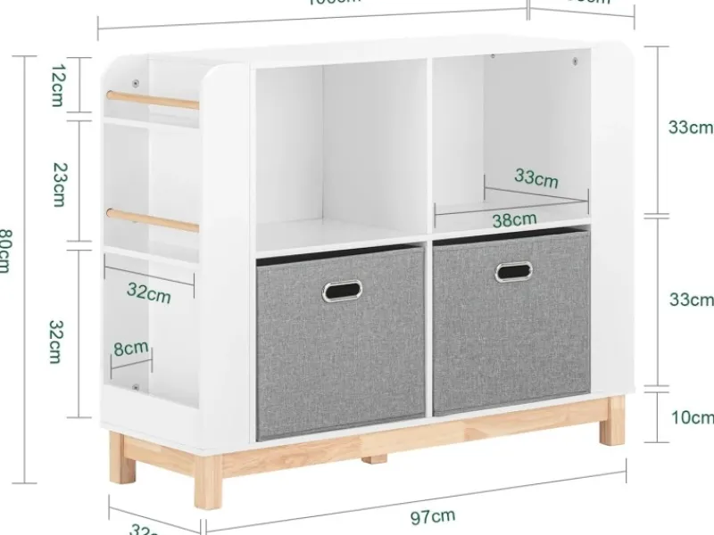 4 Fächer, 2 Stoffboxen für eine Vielzahl von Spielzeug und 6 Ablagen (3 auf jeder Seite) für Bücher.