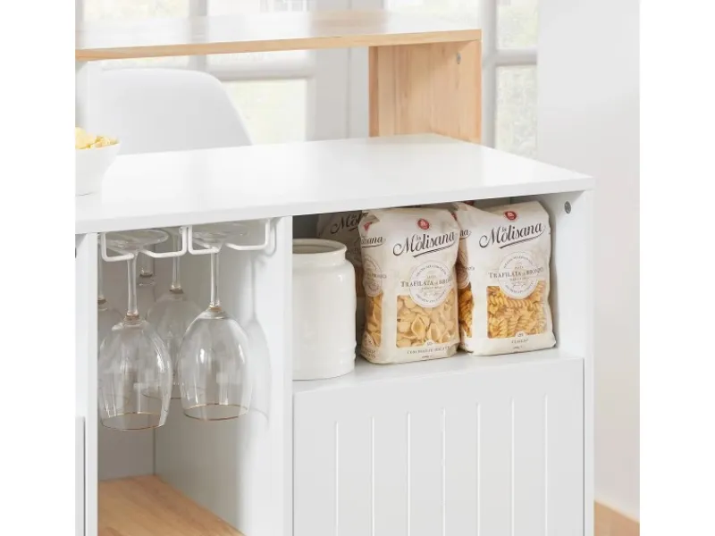 Diese Kücheninsel hat eine zusätzliche Verlängerung und eine Platte aus Kautschukholz. Deshalb eignet er sich auch als ein einzigartiger Bartisch.