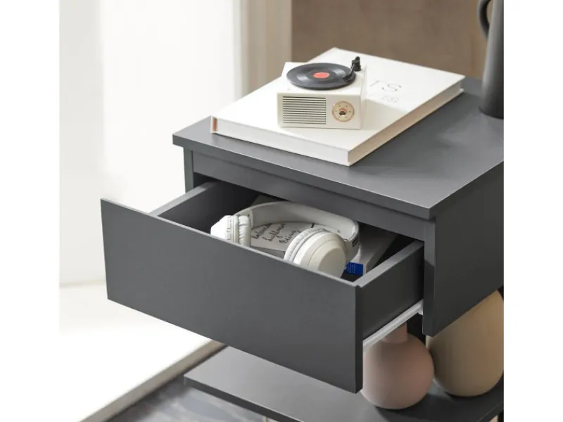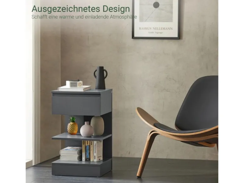 Mit Schublade und 2 Ablagen bietet dieser Nachttisch vielseitige Stauraummöglichkeiten.