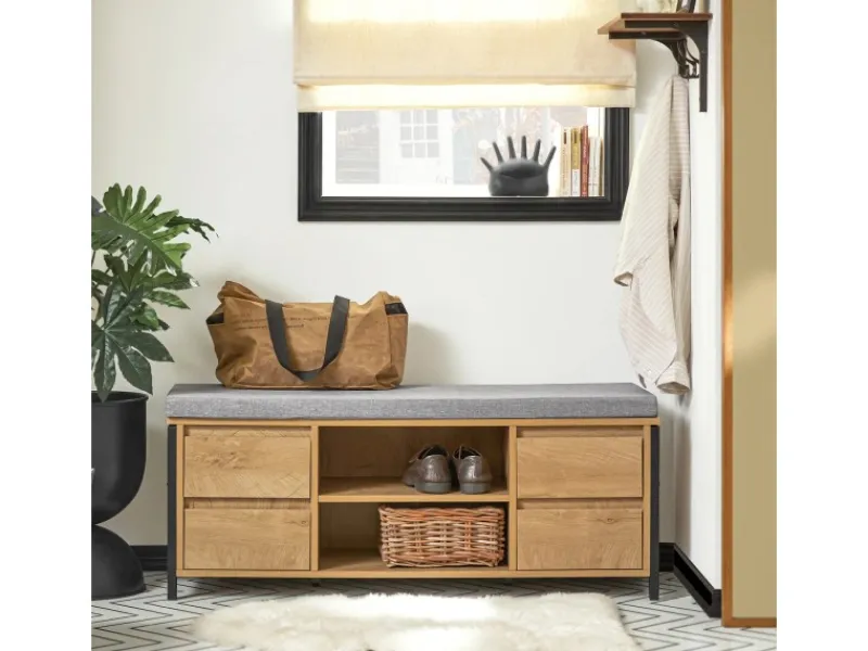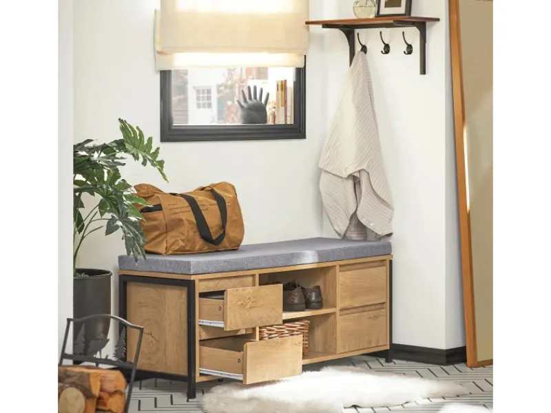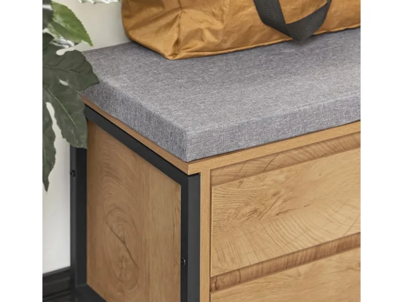 Diese Schuhbank ist mit einem weichen grauen Sitzpolster ausgestattet, um sich im Sitzen die Schuhe an- oder auszuziehen.