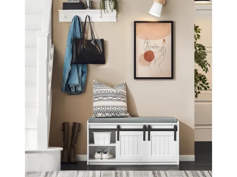 Diese Schuhbank ist mit einem Sitzkissen ausgestattet, um sich im Sitzen die Schuhe an- oder auszuziehen.