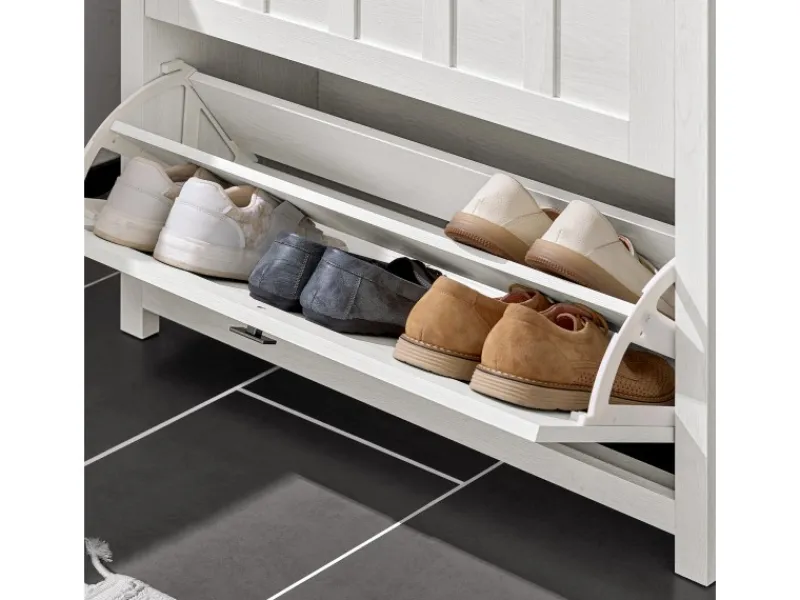 Die Höhe der Schuhfächer können durch herausnehmbare Böden verstellt werden, somit haben auch höhere Schuhe hier Platz.