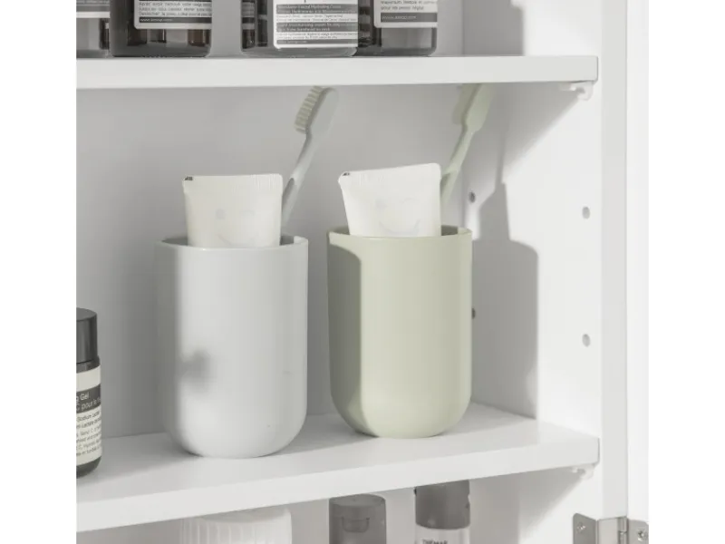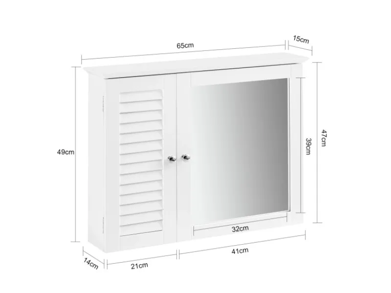 Das 2 in 1 Design (Schrank und Spiegel) ist platzsparend und schlicht für das kleine Badezimmer und macht alles darin in Ordnung.