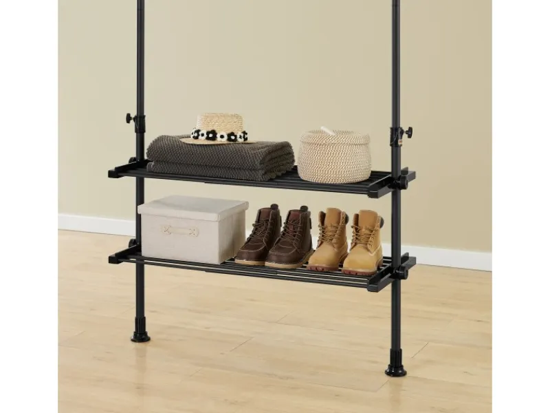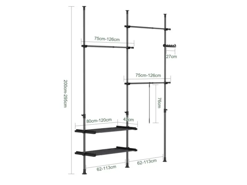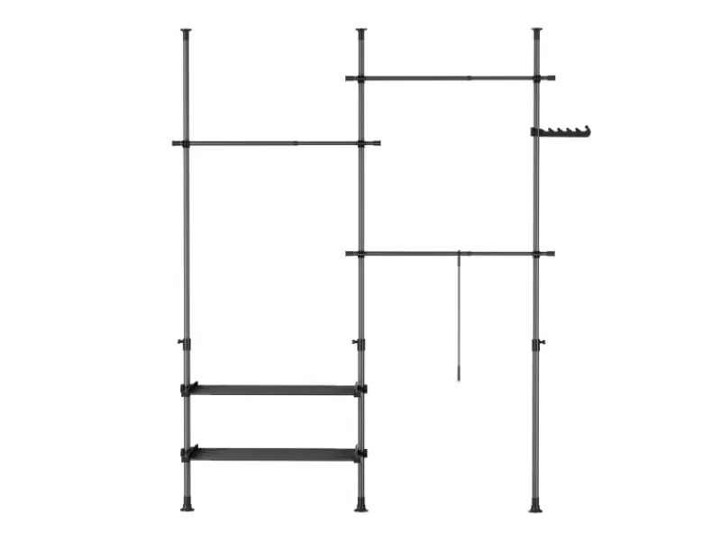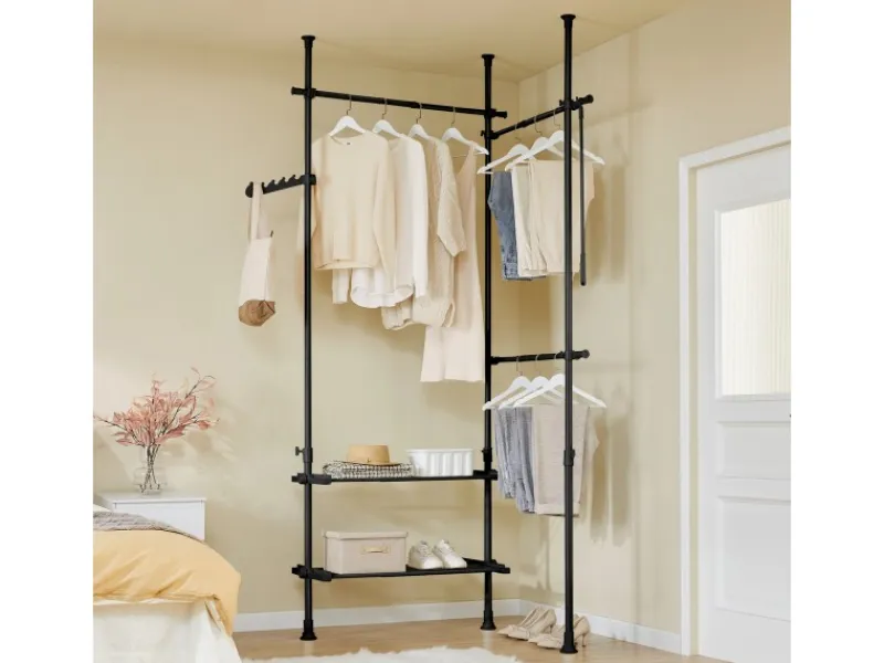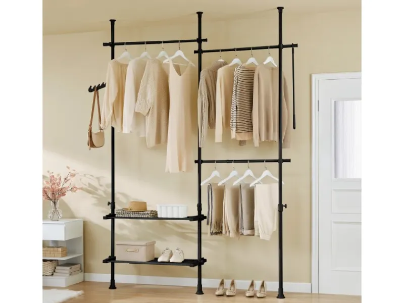 Drei vertikale Teleskopstangen, Drei verstellbare Kleiderstangen und zwei verstellbare Ablagen ermöglichen einen individuell anpassbaren offenen Kleiderschrank für Schlafzimmer, Flur oder begehbare Garderoben – ganz ohne Bohren.