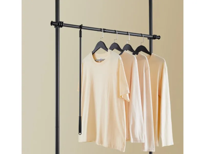 Mit der verstellbaren Konstruktion lassen sich Querstangen und Layout an Raum und Kleiderlänge anpassen – Jacken, Kleider und Hemden hängen knitterarm und übersichtlich.