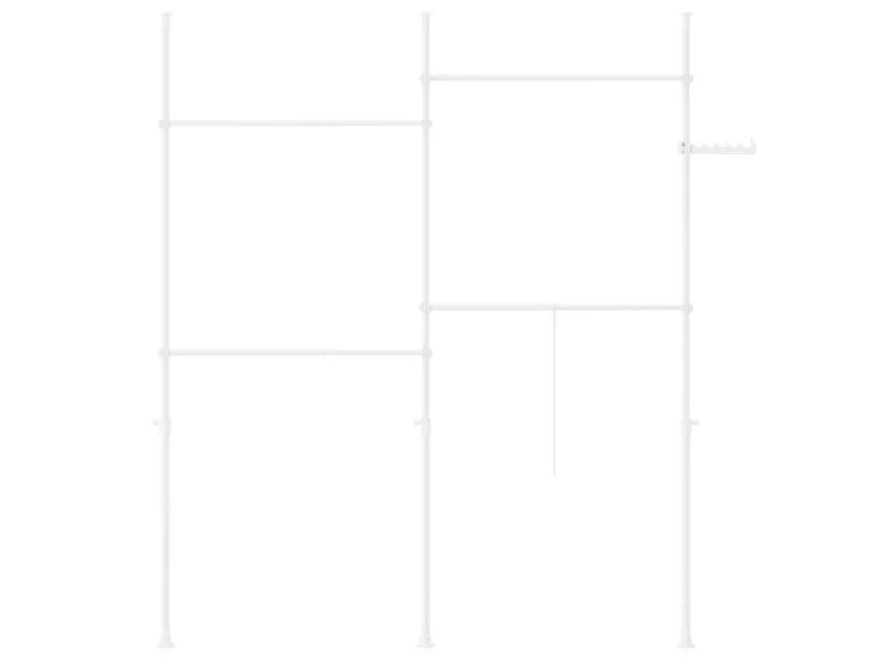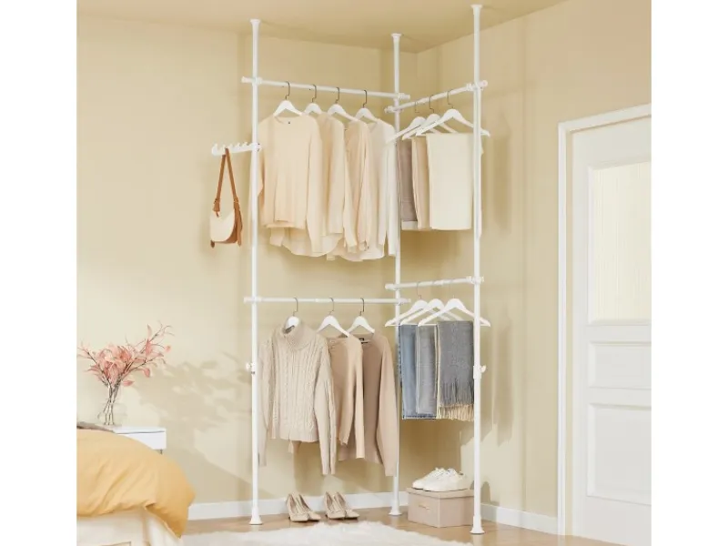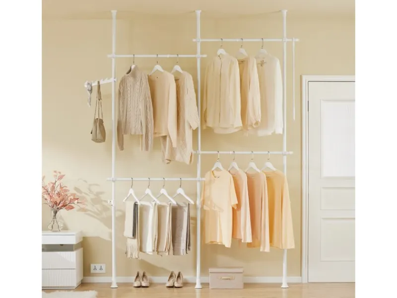 Drei vertikale Teleskopstangen und vier verstellbare Kleiderstangen ermöglichen einen individuell anpassbaren offenen Kleiderschrank für Schlafzimmer, Flur oder begehbare Garderoben – ganz ohne Bohren.
