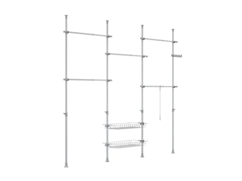 Mit 4 Teleskopstangen, 5 Kleiderstangen und 2 Körben entsteht ein flexibler Kleiderschrank.