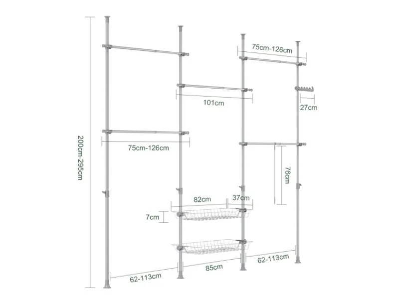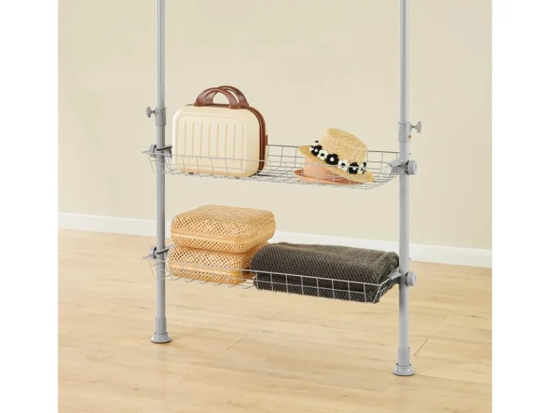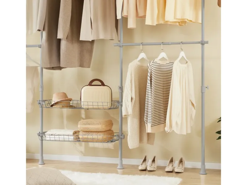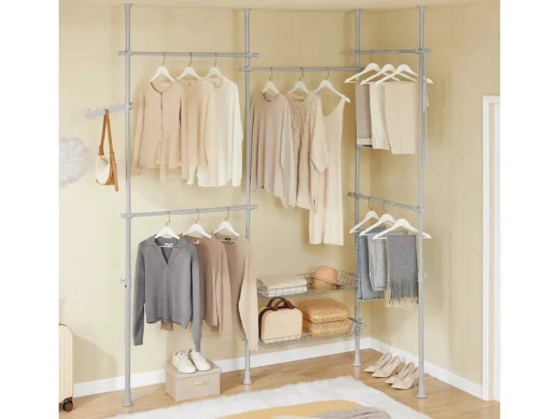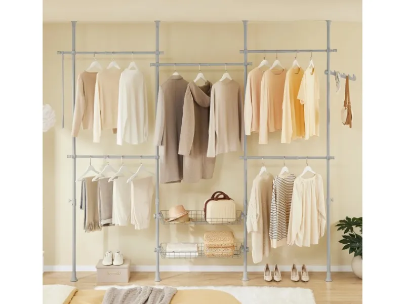 Vier vertikale Teleskopstangen, fünf verstellbare Kleiderstangen und zwei Körben ermöglichen einen individuell anpassbaren offenen Kleiderschrank für Schlafzimmer, Flur oder begehbare Garderoben – ganz ohne Bohren.